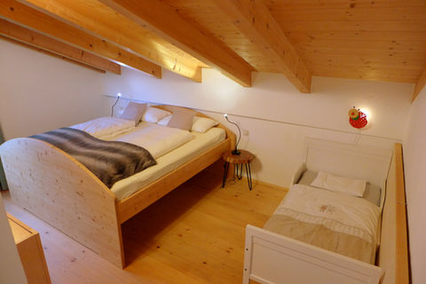 Die Schlafräume befinden sich im Obergeschoss und bieten bis zu sieben Schlafplätze. Das Badezimmer ist mit einer Dusche und einer kleinen Badewanne ausgestattet. Auf der großen Holzterrasse können Sie Ihren Feierabend genießen. Die Waschmaschine und der Trockner befindet sich im Keller.